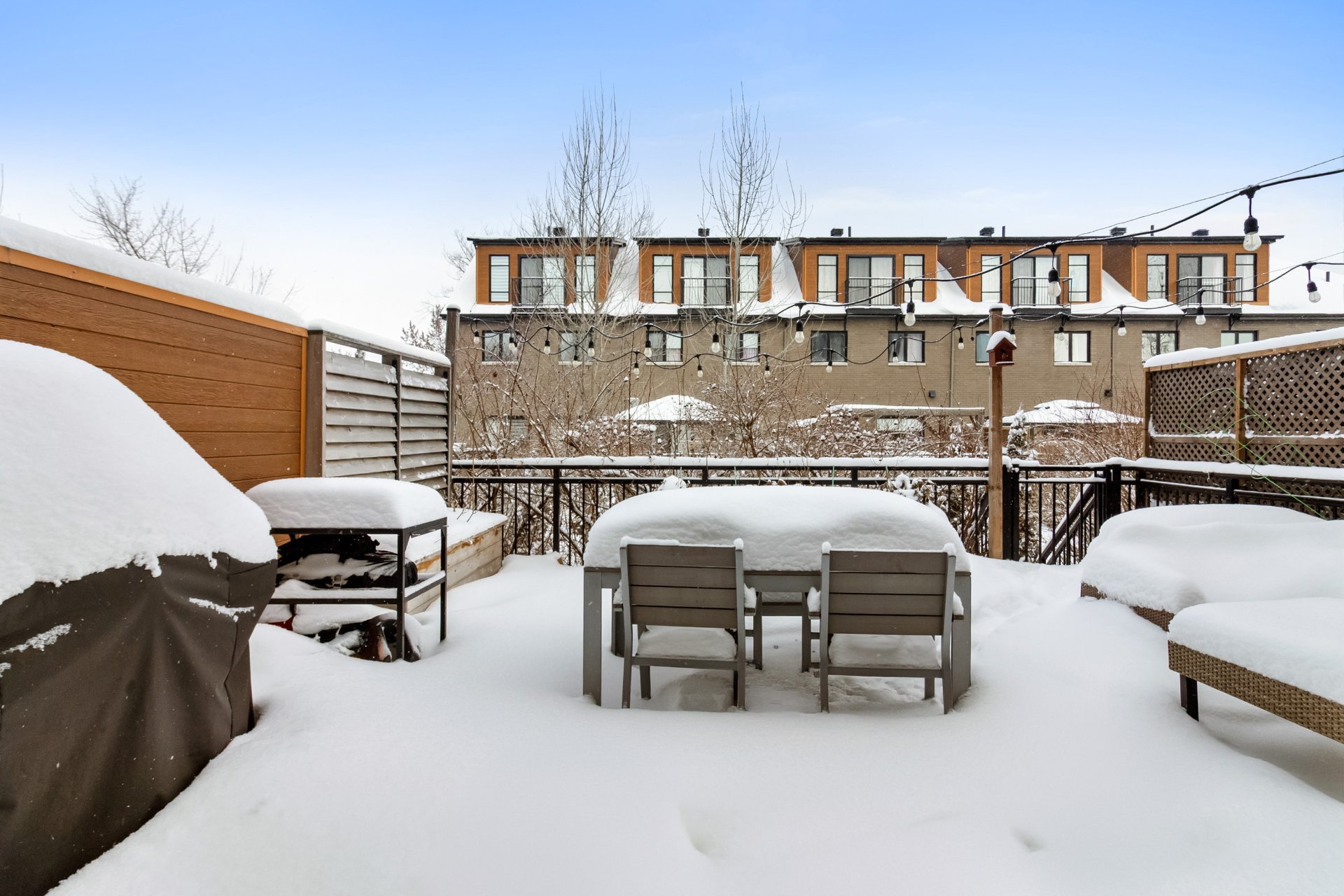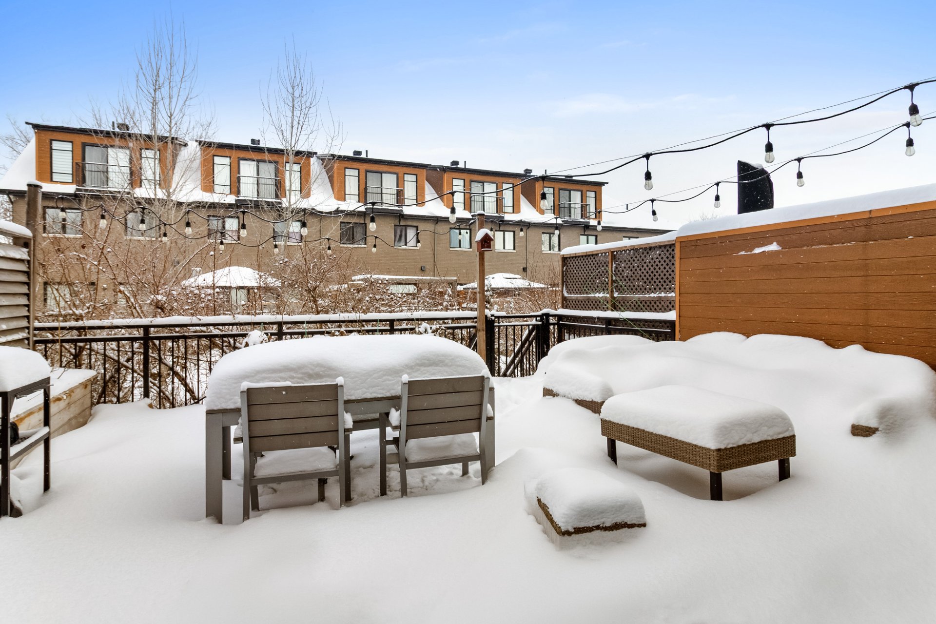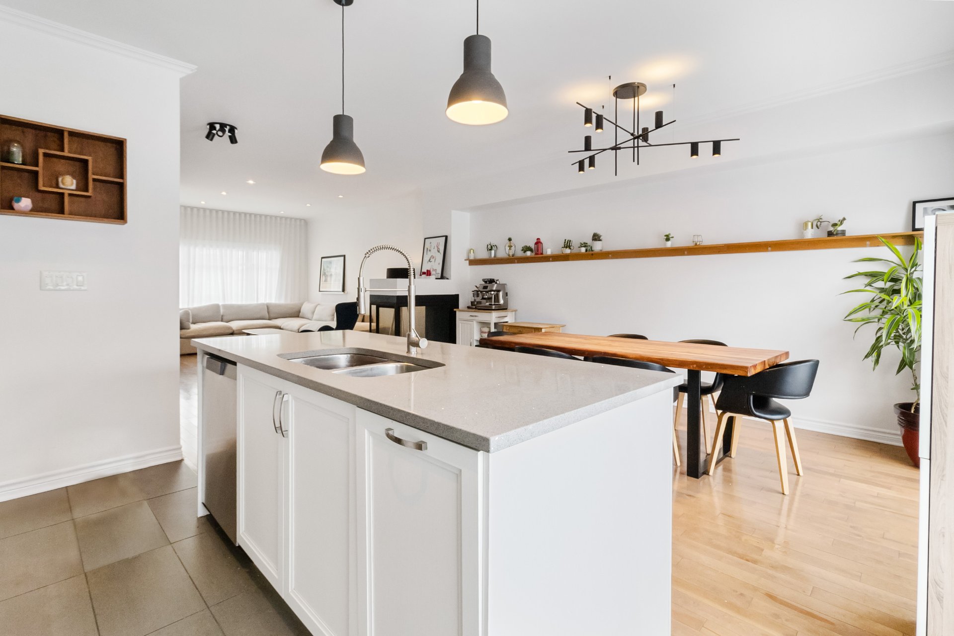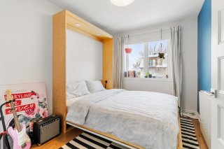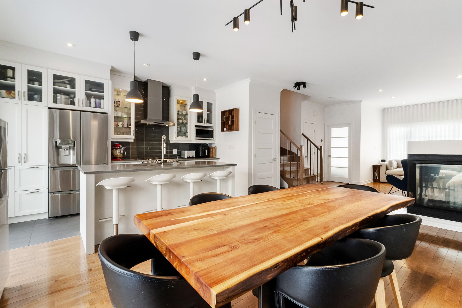 Inclus : Luminaires, rideaux, stores, hotte, four (gaz), foyer (gaz), frigo, lave-vaisselle, laveuse-sécheuse, rangement au sous-sol, lit murphy, bibliothèque.