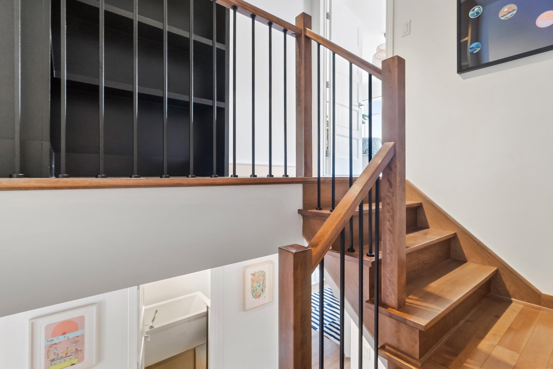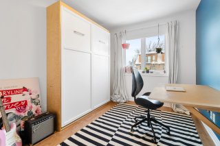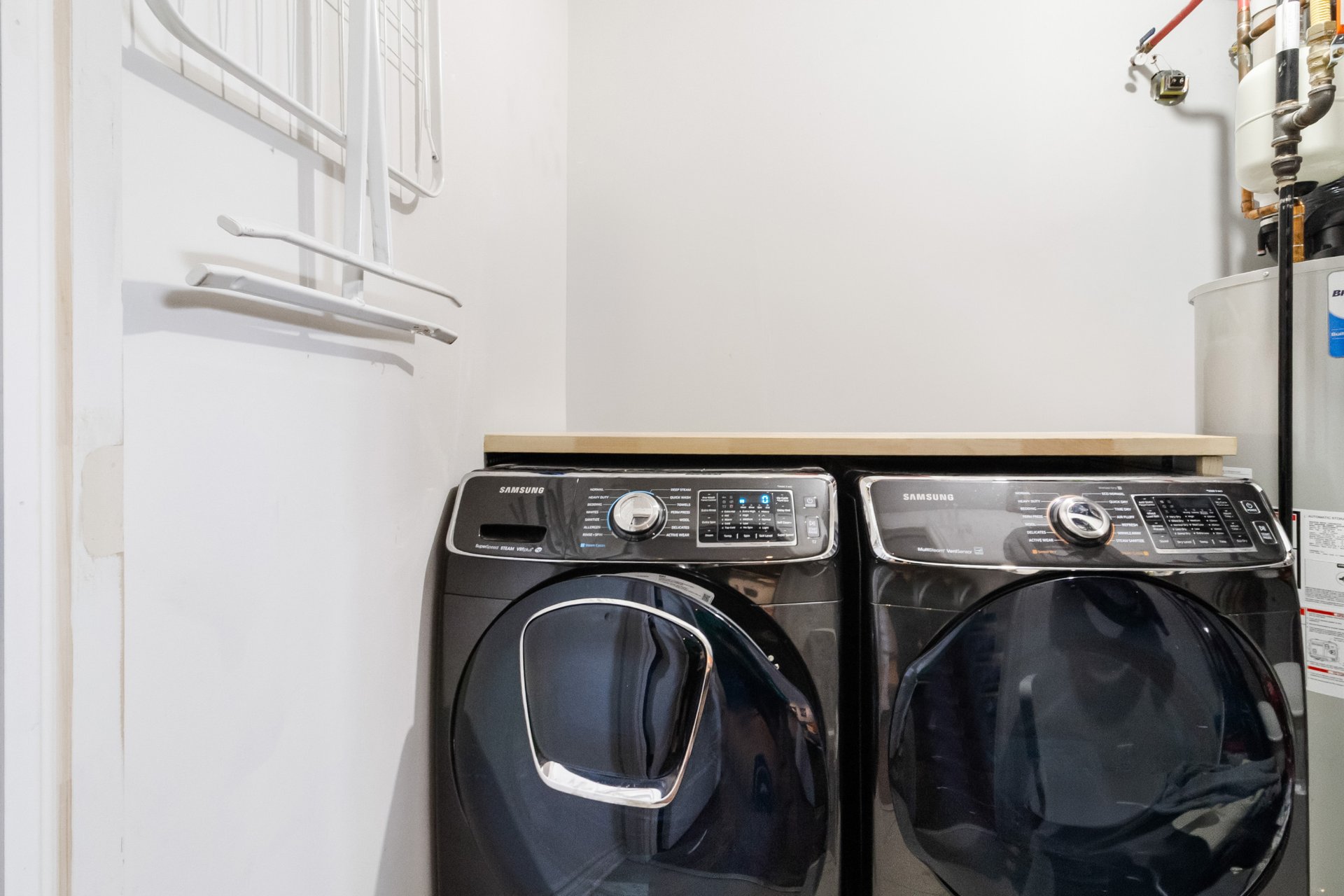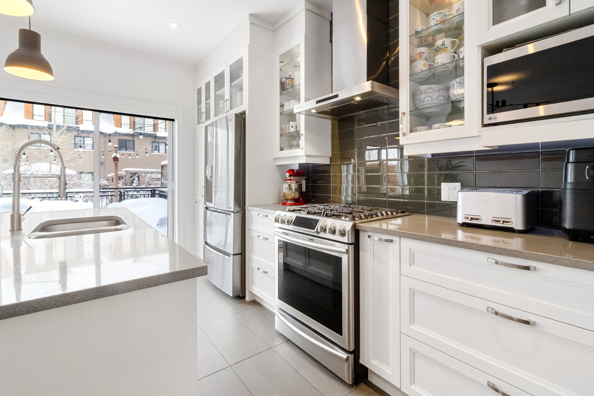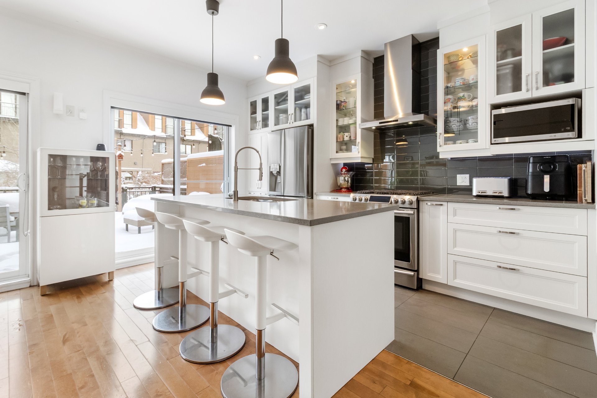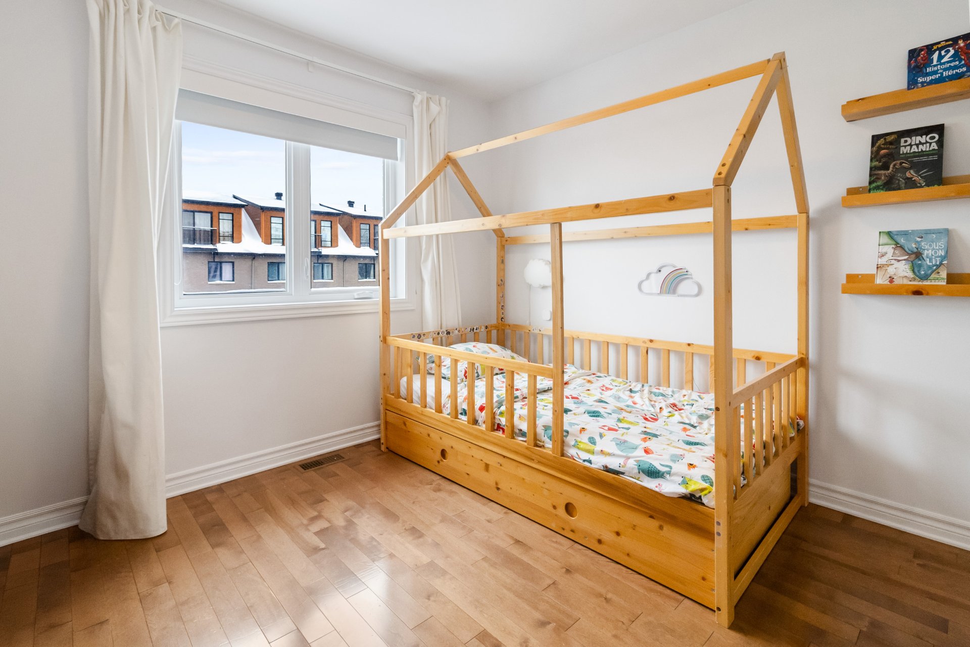 Inclus : Luminaires, rideaux, stores, hotte, four (gaz), foyer (gaz), frigo, lave-vaisselle, laveuse-sécheuse, rangement au sous-sol, lit murphy, bibliothèque.