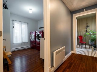 Un garage spacieux et chauffé comprend un chargeur pour